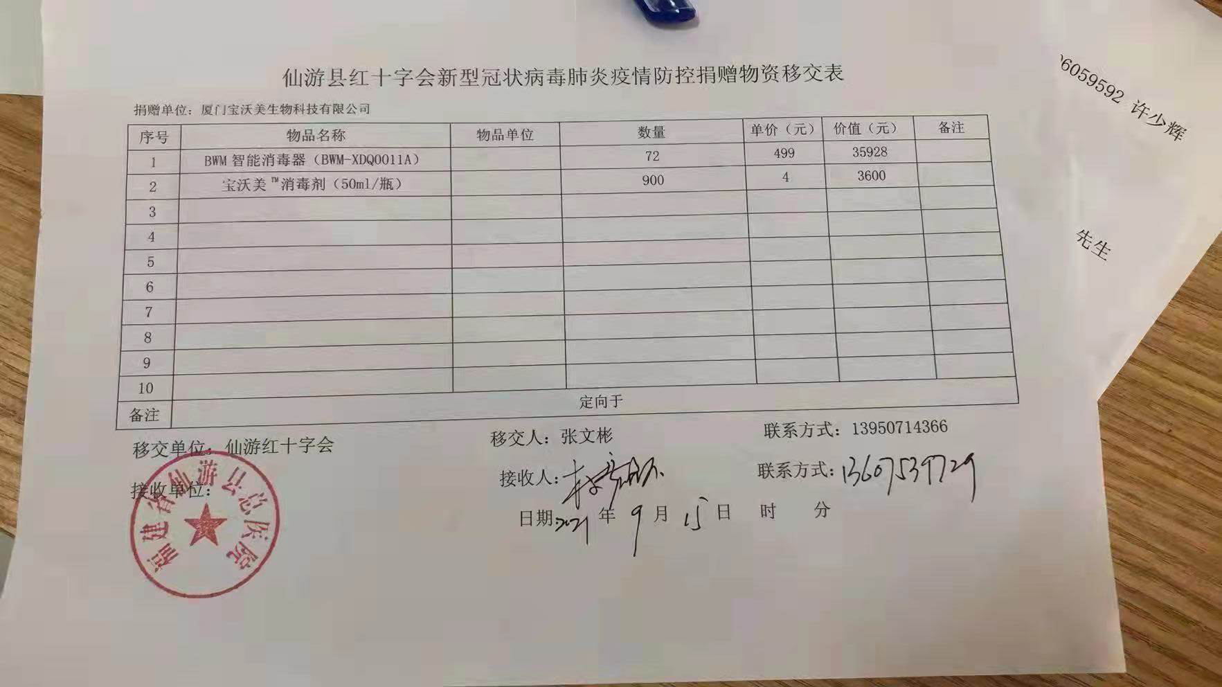 廈門寶沃美生物科技有限公司,在這次福建疫情開始,迅速組織力量,以最快時(shí)間向仙游縣醫(yī)院、公安系統(tǒng)執(zhí)勤卡點(diǎn)、隔離酒店、企事業(yè)單位、捐贈(zèng)了兩百多臺(tái)智能消毒器和配套的消毒劑。疫情之初很多口罩手套都被隨意丟棄,仙游公安系統(tǒng)針對(duì)大量的廢棄囗罩,手套等,帶感染性的物品,在各主要道路,卡囗,單位入囗,配置了帶智能消毒器的垃圾桶,每小時(shí)會(huì)自動(dòng)對(duì)感染廢物,定時(shí)消毒,該舉措極大降低感染性廢物的風(fēng)險(xiǎn),同時(shí)大大降低環(huán)衛(wèi)人員彼二次感染的風(fēng)險(xiǎn)。給仙游縣公安人員點(diǎn)贊。